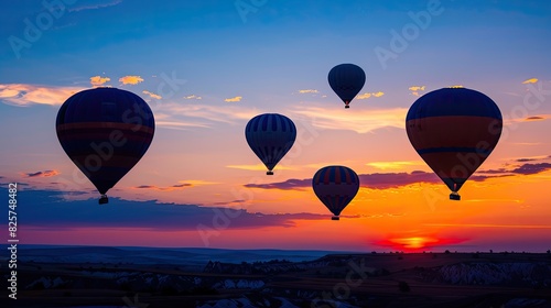 Naklejka premium sky at sunset with hot air balloons. Travel on vacation