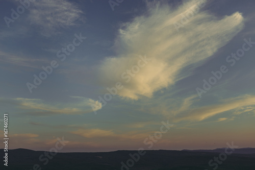 Fototapeta premium Sky. Beautiful clouds over the valley. Landscape. Background with cloudy sky. Incredible view. Patterns from the clouds. Evening.