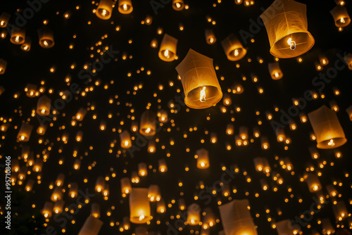 © Purple_Lamp, Obraz premium Sky Lantern Festival with Thousands of Glowing Lanterns Floating at Night