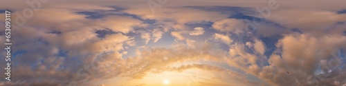 Fototapeta premium 360 sky panorama of vibrant pink Cumulus clouds at sunset, seamless hdr...
