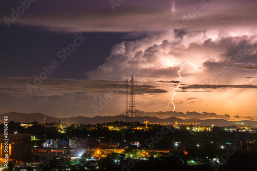 © Peerapixs, Naklejka premium Sky with lightning striking hills behind small town