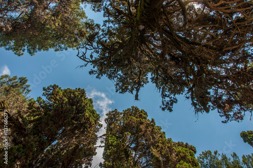 Obraz premium Sky with tree crowns. View up from ground level. Beautiful nature. Blue sky...
