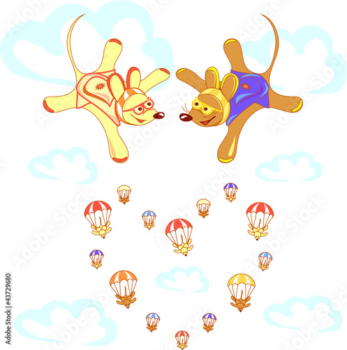 © nairina, Obraz premium Skydivers animals in free fall between the clouds