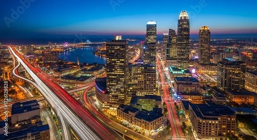 © Sabrina, Fototapeta premium Skyline at Dusk: A sprawling cityscape glistens under a vibrant dusk sky.