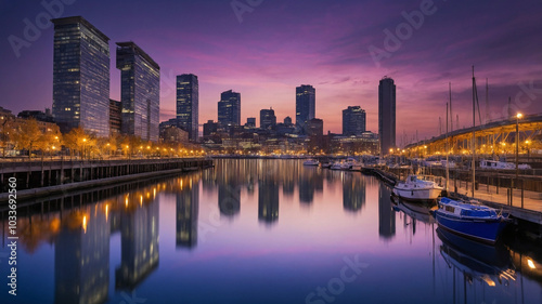 Naklejka premium Skyline at dusk with shimmering reflections and vibrant hues over the peaceful waterfront cityscape.