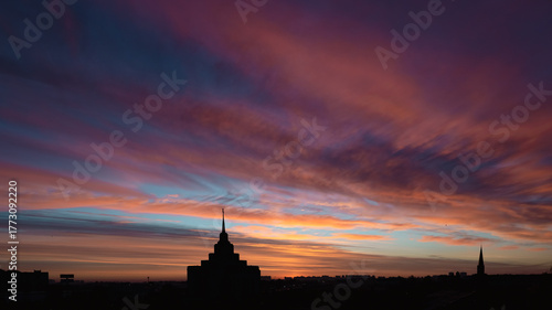 © Larysa, Obraz premium Skyline at sunrise. Colorful dawn. Sky of Ukraine. Mormon Church. European country. Megapolis Kyiv. Panorama of a big city. Sky gradient. Enchanting beauty of nature. Tourism in Europe.