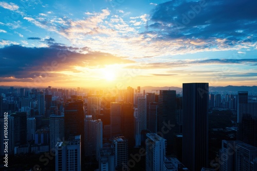 Fototapeta premium Skyline at sunset, cityscape with buildings silhouetted against colorful clouds.
