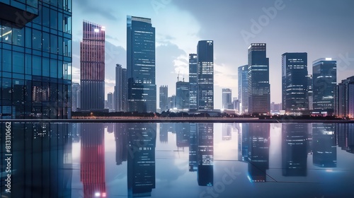 Fototapeta premium skyline building, river water reflection, clear sky