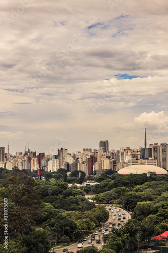 © Vernaglia, Fototapeta premium Skyline da cidade de São Paulo, com destaque para zona sul, prédios e céu parcialmente nublado.