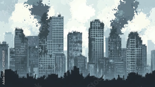 © RizArt, Fototapeta premium Skyline depicts a ruined cityscape with smoke and destruction