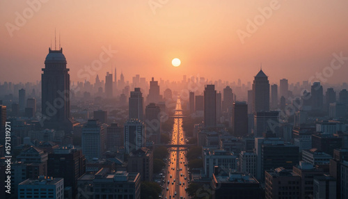 © Zunopixl , Obraz premium Skyline Embrace: A city silhouette is beautifully backdropped by a radiant sun, casting a warm glow over a metropolitan expanse. This visual tale weaves an aesthetic of urban grandeur.