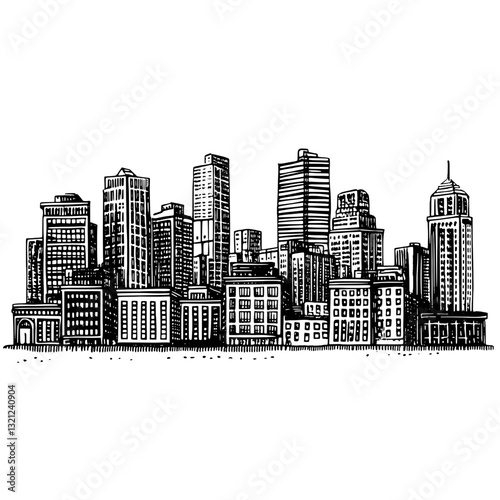 Fototapeta premium Skyline engraving showcasing architectural beauty and urban life in a bustling city landscape perfect for tattoo and packaging design