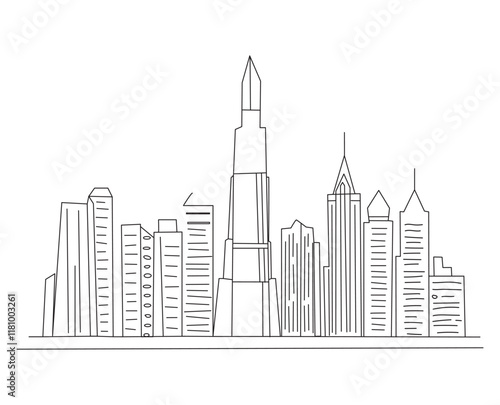 © ANKITA PATEL, Obraz premium skyline line art drawing style. Cityscape of Chicago with silhouettes of most famous buildings and towers. design isolated on white background. Vector illustration.
