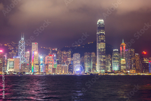 © Alex Pelikh, Fototapeta premium Skyline night view of tall buildings from across Victoria Harbor