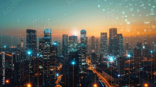 Obraz premium Skyline of a future metropolis, gold investments fueling ecofriendly tech and...
