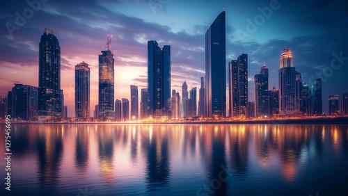 © Chanchai, Fototapeta premium skyline of a modern city with iconic skyscrapers illuminated at twilight, reflections shimmering on glass facades