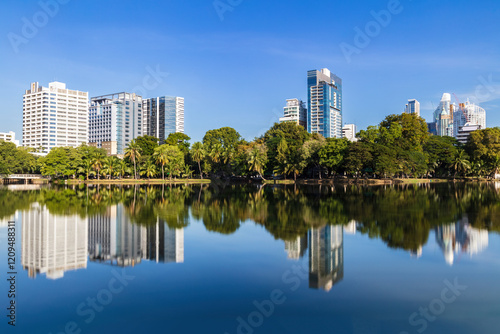 © dhayes, Fototapeta premium Skyline of Bangkok, Thailand, viewed from Lumphini park across the lake. Reflection of skyline in the water.