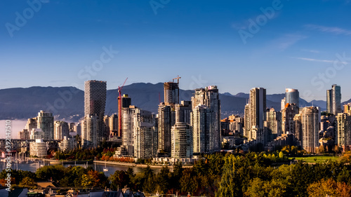 Obraz premium Skyline of Downtown Vancouver, British Columbia, Canada at Sunset. Viewed from the South Shore of Falls Creek