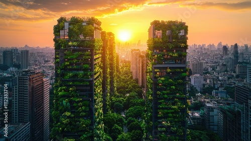 © Jiraporn, Obraz premium Skyline of green buildings at sunset in a vibrant urban setting.
