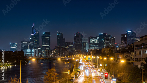 © Loic Timelapse, Fototapeta premium Skyline of La Defense Business District at Night With Traffic