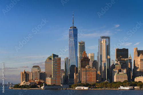 Obraz premium Skyline of Manhattan with its tall skyscraper buildings before sunrise. Visit New York, travel to America. One of the best places to see.