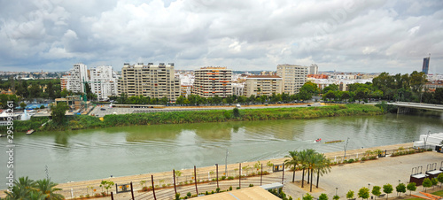 Fototapeta premium Skyline of modern Los Remedios neighborhood and Guadalquivir river in...