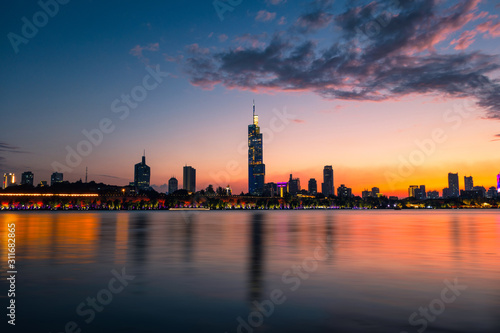 © SN, Naklejka premium Skyline of Nanjing City by Xuanwu Lake at Sunset