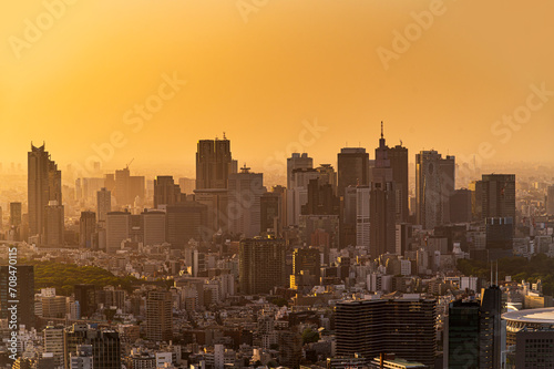 Obraz premium Skyline of tokyo city with gold light sunset or sun rise sky background in winter season, Tokyo, Japan