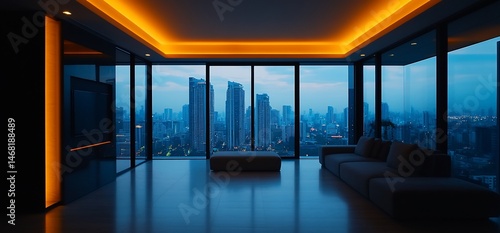 © Rastika, Fototapeta premium Skyline Serenity: Modern Apartment View with Orange Ambient Lighting Accent