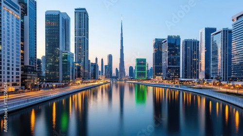 © Tin, Fototapeta premium Skyline view of modern skyscrapers reflecting on calm water at twilight.
