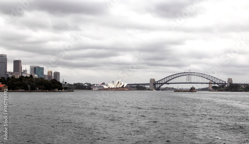 Naklejka premium Skyline von Sydney mit Opera House und Harbour Bridge an einem bewölkten Tag.