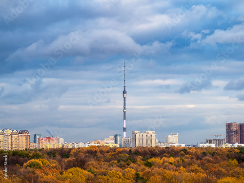 © Ekaterina, Fototapeta premium skyline with autumn forest and city