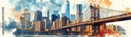 Obraz premium Skyscraper city framed by a bridge, modern architecture meeting classic design, watercolor style