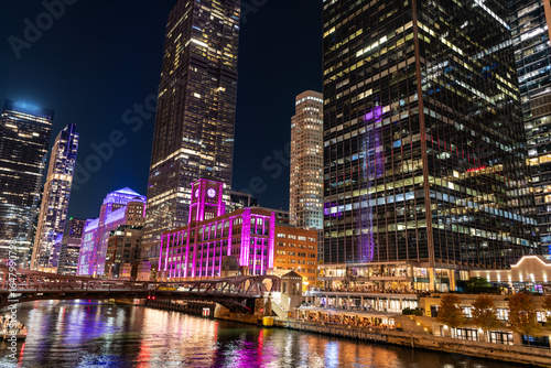 Fototapeta premium Skyscraper cityscape. Night city of Chicago. Business city. Night cityscape of Chicago skyscraper building. Chicago architecture of skyscraper. City night illuminated building. Twilight cityscape