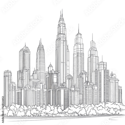 © Anha, Naklejka premium Skyscraper Cityscape Sketch Black White Architecture Drawing Modern City