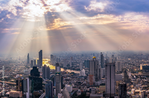 © fotoslaz, Obraz premium Skyscraper on cityscape at Chaopraya river in Bangkok metropolis Thailand on sunset time
