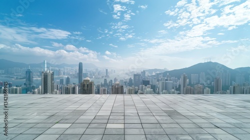 © Chandara, Fototapeta premium Skyscraper roof with cityscape view below.