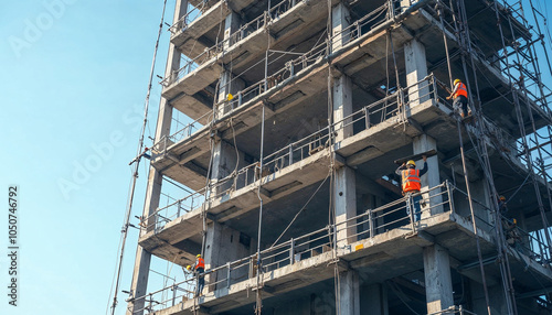 Fototapeta premium Skyscraper scaffolding scene highlights urban development and construction teamwork.