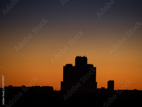 © Konstantin Belov, Fototapeta premium Skyscraper tower silhouette over dark forest on sunset and clear sky as background. Sunny weather (Moscow city, Russia)
