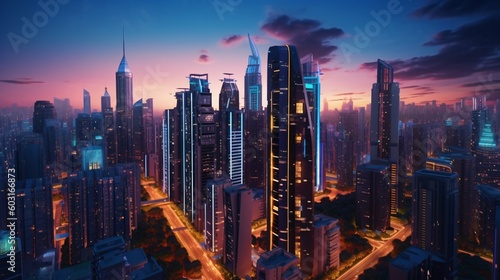 Fototapeta premium skyscraper, with its sleek lines, reflective glass facade, and vibrant city lights. Made by generative AI.