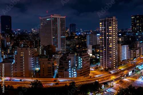 © Tierney, Fototapeta premium Skyscrapers and highways through Minato, Tokyo, Japan