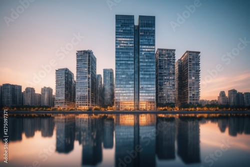 © Ayahe Stock, Obraz premium Skyscrapers and modern buildings reflecting on the river or sea at night in an urban cityscape