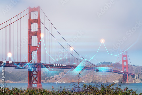 © VideoFlow, Fototapeta premium Skyscrapers Cityscape Downtown View, San Frencisco Skyline Buildings. Beautiful Real Estate. Day time. Forex Financial graph and chart hologram. Business education concept.