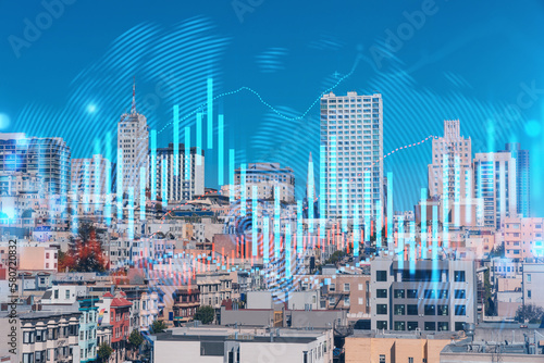 © VideoFlow, Fototapeta premium Skyscrapers Cityscape Downtown View, San Frencisco Skyline Buildings. Beautiful Real Estate. Day time. Forex Financial graph and chart hologram. Business education concept.