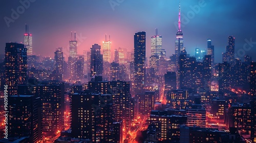 © Raitalinn, Fototapeta premium Skyscrapers glow through the fog in a mysterious cityscape under the night sky.