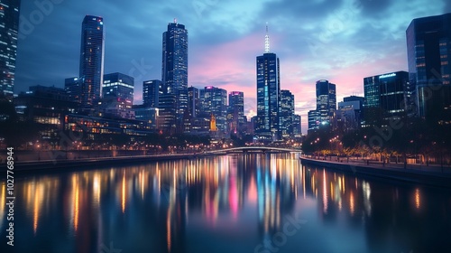 Fototapeta premium Skyscrapers in a modern city skyline at dusk, illuminated by warm lights, vibrant city life, reflection in the river, contemporary architecture, high-resolution details, night scene