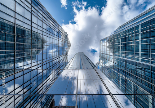 Fototapeta premium Skyscrapers in London's financial district reflect the blue sky and white clouds