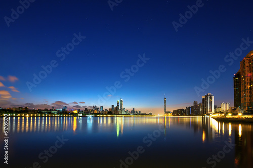 © zhu difeng, Fototapeta premium skyscrapers near the river at night