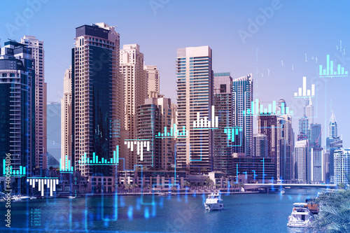 Fototapeta premium Skyscrapers of Dubai business downtown. International hub of trading and financial services of Western Asia. FOREX graph and chart concept. Double exposure. Dubai Canal waterfront.