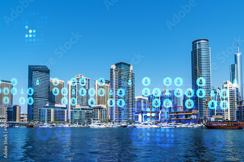 Fototapeta premium Skyscrapers of Dubai business downtown. International hub of trading and financial services. Social network icons hologram, concept of human resources. Double exposure. Dubai Canal waterfront.